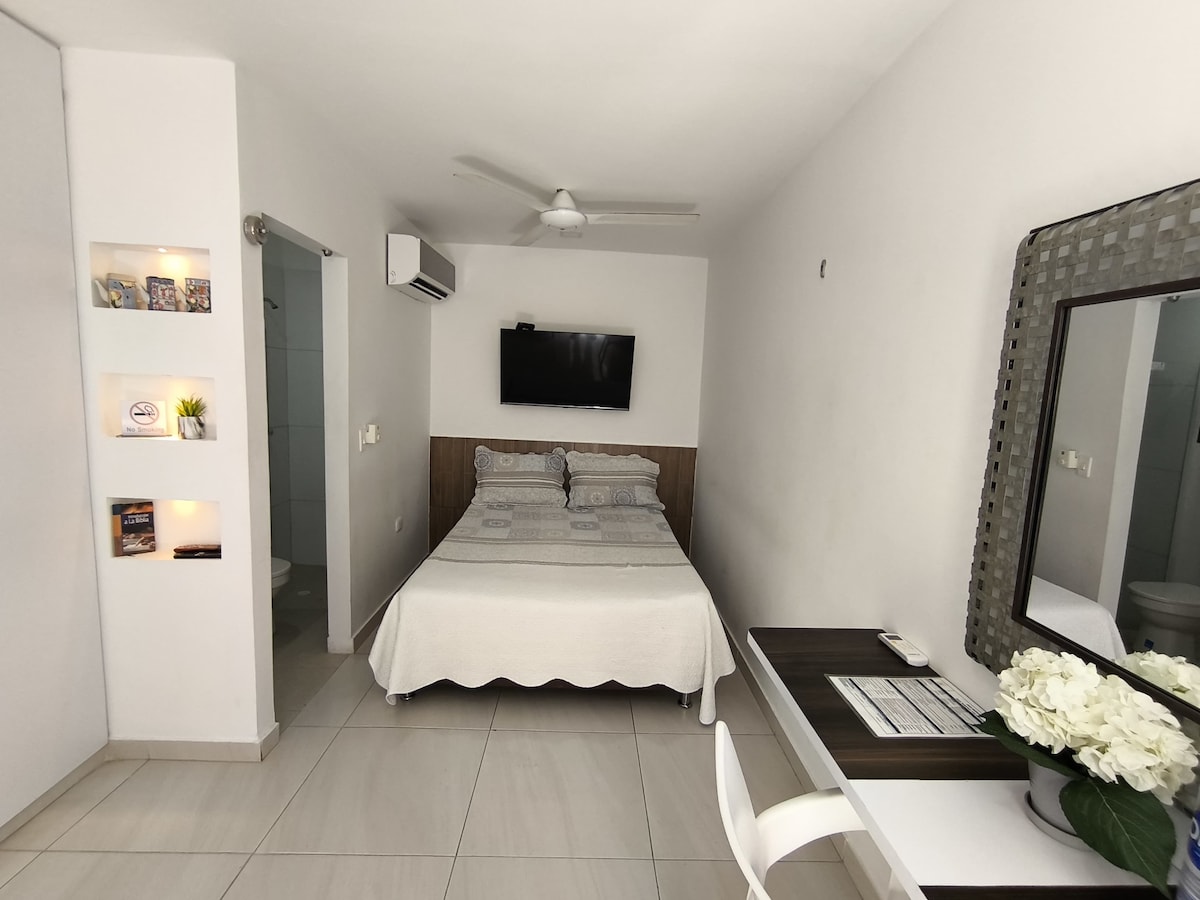 Disfruta de la sencillez de este alojamiento tranquilo y céntrico. Ubicado en un cuarto piso. Ofrece confort y tranquilidad, ubicado estratégicamente en el norte de la ciudad, frente de uno de los principales parques de la ciudad, restaurantes y supermercados. Cuenta con un colchón ortopédico tamaño queen, aire acondicionado, smart tv con base giratoria para que puedas ver tv desde la sala o desde el cuarto, cocina equipada lista para cocinar. EL AGUA DE LA DUCHA ES AL CLIMA.