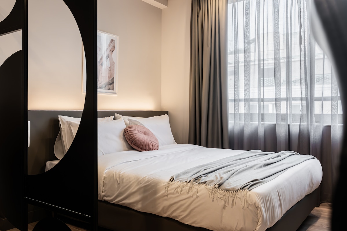Elegant, modern apartment in Monastiraki, Athens' most central neighborhood. Located merely 300 meters from the Monastiraki subway station, our space offers brand-new hotel design with luxurious finishes. Ideal for a comfortable and memorable stay for a few days, weeks or even months, it beckons you to experience a stylish immersion into the very heart of Athens. Breathing new life into a mid-century textile manufacture, our building’s façade and overall architecture serves as a constant visual