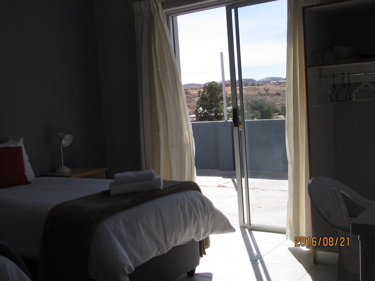 Our place is close to great views, hotel/restaurant, shop, and fuel station. Staying in Aus is like living on a farm - quiet and peaceful. Perfect to stay two nights. Visit Luderitz - 120km for the day, stay second night before continuing either to Sossos Vlei or Fish River Canyon. The room has comfortable beds, a kitchenette, wooden floor and quality linen. Our place is good for couples, adventurers (famous for mountain biking and hiking), business travelers, families and groups.