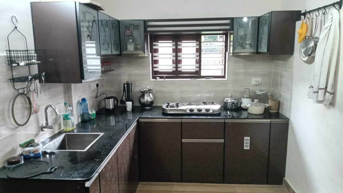 La casa tiene 3 dormitorios, 2AC y uno sin aire acondicionado, todos con baños adjuntos (dos con calentadores),un pasillo y un baño común que rodea un patio central conocido como naalukettu, un sello distintivo de la arquitectura tradicional de Kerala. Todas las habitaciones están bien ventiladas con ventanas con mosquiteros. El salón tiene una mesa de comedor con 6 sillas, sofá y un diwan. La cocina modular con área de trabajo tiene nevera, estufa de gas, purificador de agua Aquaguard, mixie, etc. El pasillo que conduce a la habitación Pooja y un patio son ideales para la relajación.