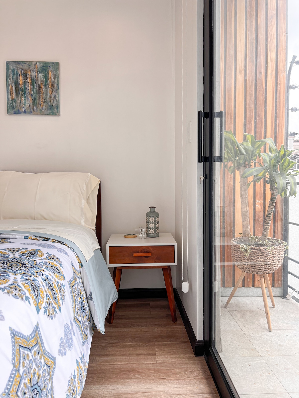 Este elegante alojamiento es ideal para noches de pareja, familia corta o estadías largas de trabajo. Contamos con jacuzzi dentro del departamento, chimenea de bioetanol y una sala con una pantalla de 85” para las mejores noches y experiencias inolvidables de sus vacaciones. Cama tamaño king y hermosos balcones. Cocina propia con todos los implementos necesarios. Cerca de lavanderías, tiendas, restaurantes. Parqueadero propio y cámaras con vista a la calle para su tranquilidad.