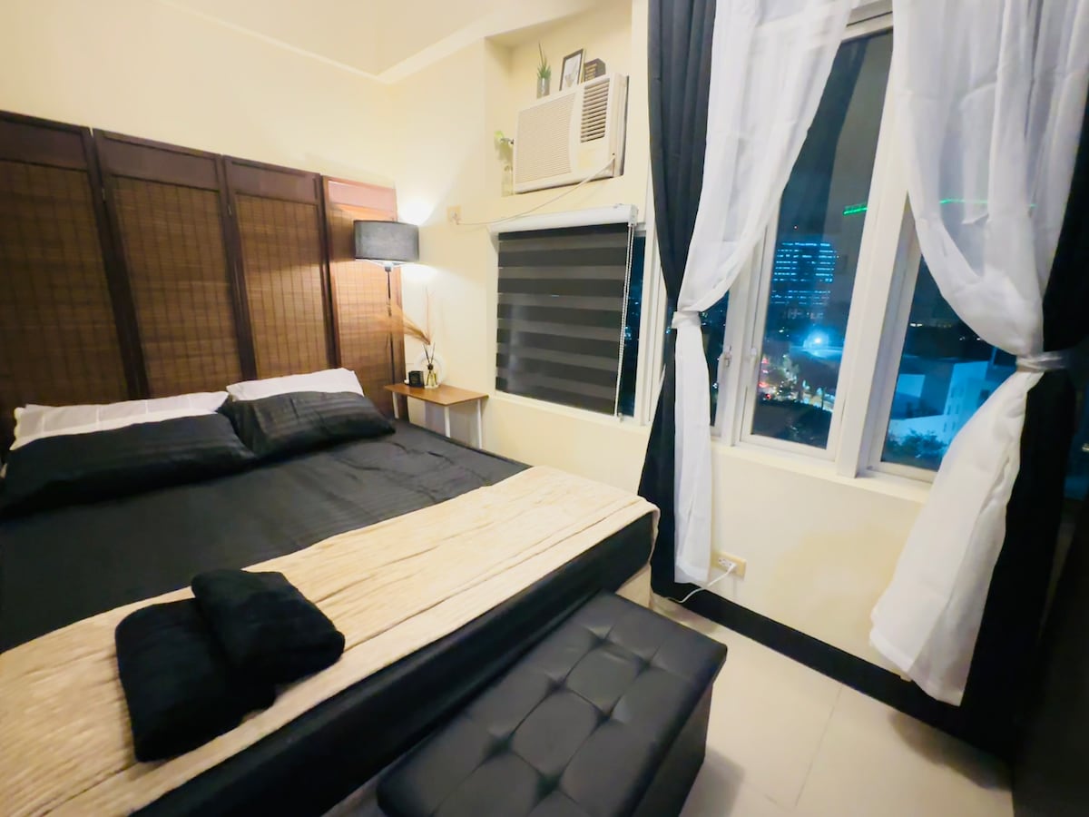 El espacio es un apartamento de un dormitorio de 38 metros cuadrados, con balcón, con una impresionante vista de 90 grados de Alabang, Skyway y la zona de la piscina del edificio y el exuberante jardín, lo que lo convierte en un equilibrio de espacios urbanos y verdes. Ideal para una estancia, como una alternativa de trabajo desde casa, o para familias que quieran relajarse y disfrutar del tiempo juntos. Es una unidad construida con detalles intrincados, espaciosa en comparación con una habitación de hotel al mismo precio. Nuestro propio aparcamiento en el sótano se proporciona a los huéspedes sin coste adicional.