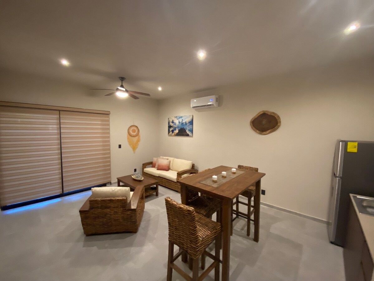 Vive la magia de Bacalar en nuestro hermoso departamento totalmente equipado y decorado estilo tropical contemporáneo. Cuenta con 1 habitación, cama kingsize, sala con sofá cama, terraza privada, comedor, baño, cocina, A/A, 2 smartTV de 50”, Wifi de alta velocidad. Acceso al Rooftop donde hay una gran piscina con vistas espectaculares a la laguna y la selva. Actualmente, debido a la construcción del tren Maya, hay un poco de ruido de la carretera. Si son de sueño ligero, podrían notarlo.