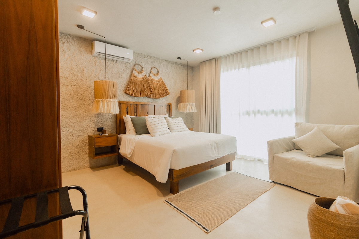 Disfruta de una experiencia con estilo en este alojamiento céntrico tipo ”Loft", nuevo decorado, amplio y moderno con cocineta, refrigerador , desayunador, sala , un baño y medio, Tv con cable, wifi, aire acondicionado, recamara con cama queen size. la parte de arriba tiene 185 cm de altura. Estamos cerca del centro, de oficinas de gobierno, del bulevar, y tiendas de convencia