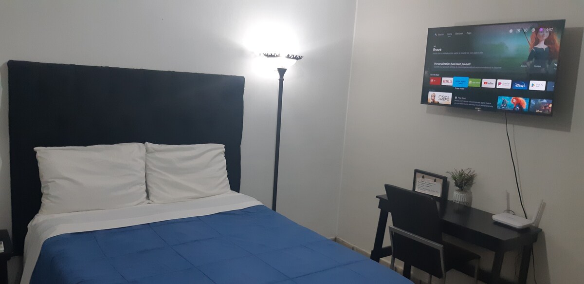 Ubicado en el centro de la ciudad a una cuadra del Hospital San Jose. Cuenta con baño privado dentro del departamento y esta equipado con cómoda cama matrimonial de memoryfoam, cocineta, internet de buena calidad, smart TV Roku ... Ideal para viajes de trabajo(facturamos). Contamos con servicio de transporte(costo extra).