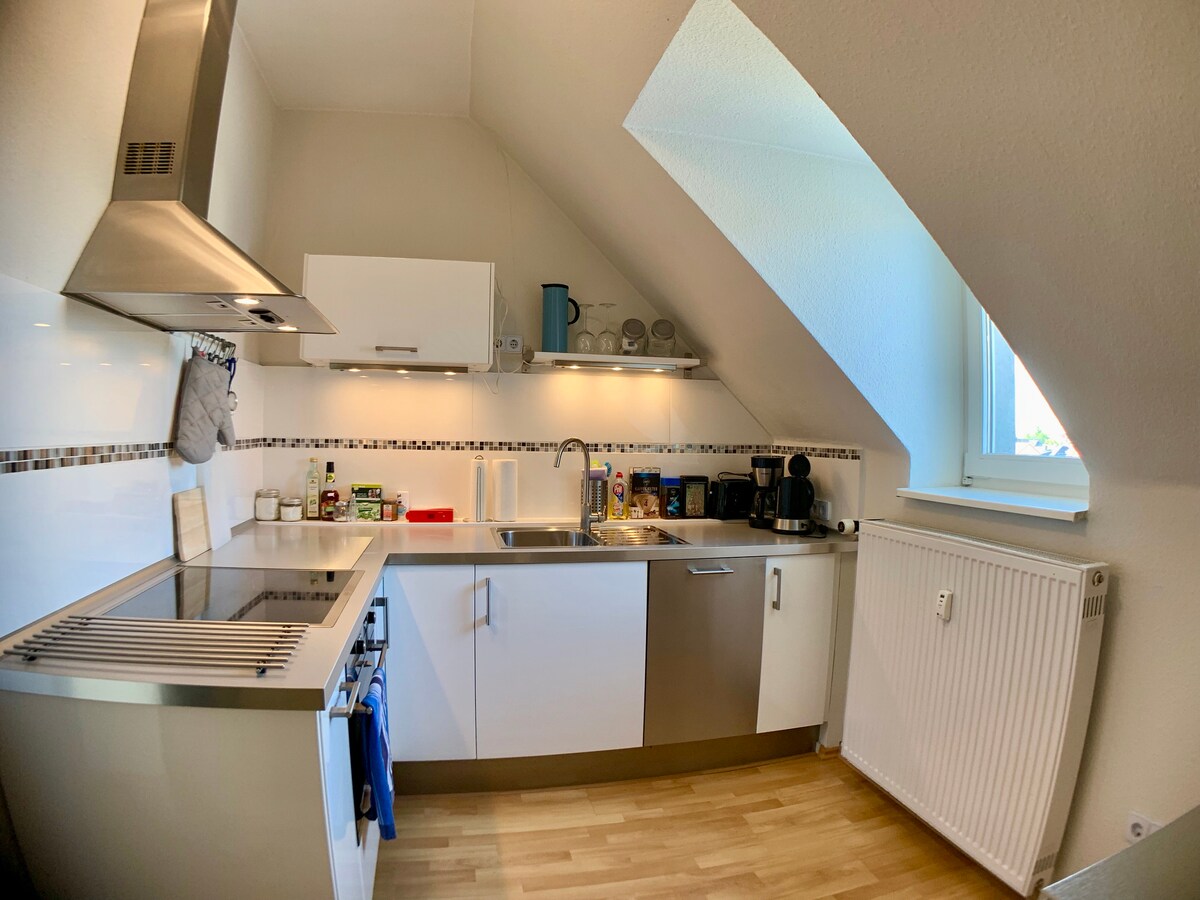 Disfruta de tu tiempo en nuestro elegante y amorosamente amueblado apartamento. Nuestro apartamento tiene una sala de estar/comedor abierta con cocina, un dormitorio separado y un baño con ducha. La cocina está equipada con lavavajillas, fogones, nevera (con congelador) y cafetera. En el dormitorio encontrarás una cómoda cama doble de 140 cm y un armario. Otro espacio para dormir está disponible en el sofá cama.