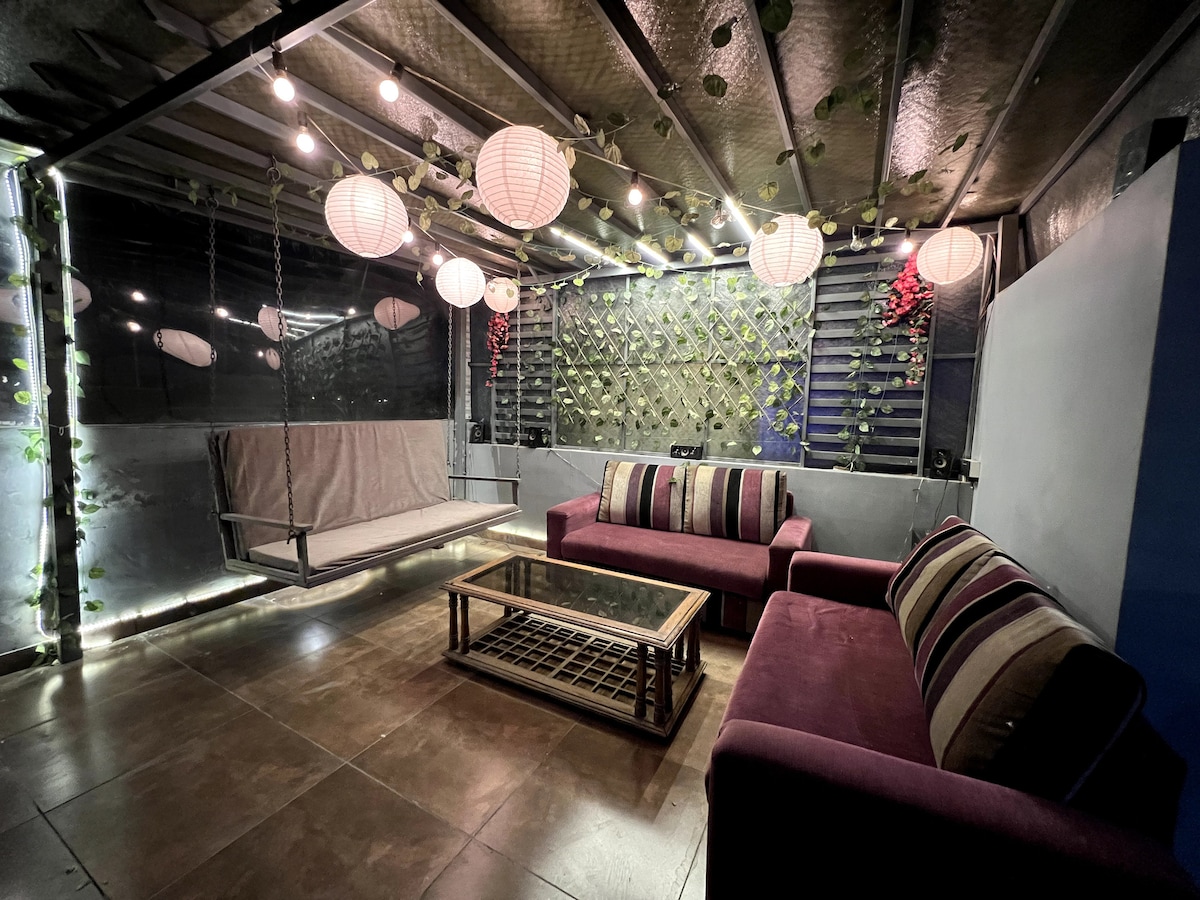 Boho-luxury 1BHK con un ambiente cálido y acogedor con un balcón privado con columpio acolchado y luces de hadas. ✨ Disfruta de un televisor inteligente de 55” con barra de sonido y subwoofer para una experiencia similar a la del cine. La estancia ofrece aire acondicionado, purificador de aire, inducción, nevera, RO, utensilios de cocina y té/café. 🙌🏻 Cerca del metro Shalimar Bagh, a solo 100 m de KFC, Domino's y McDonald's, y cerca de PVR y Pacific Mall. 📍 Ideal para citas o cumpleaños, con decoración disponible a pedido.❤️