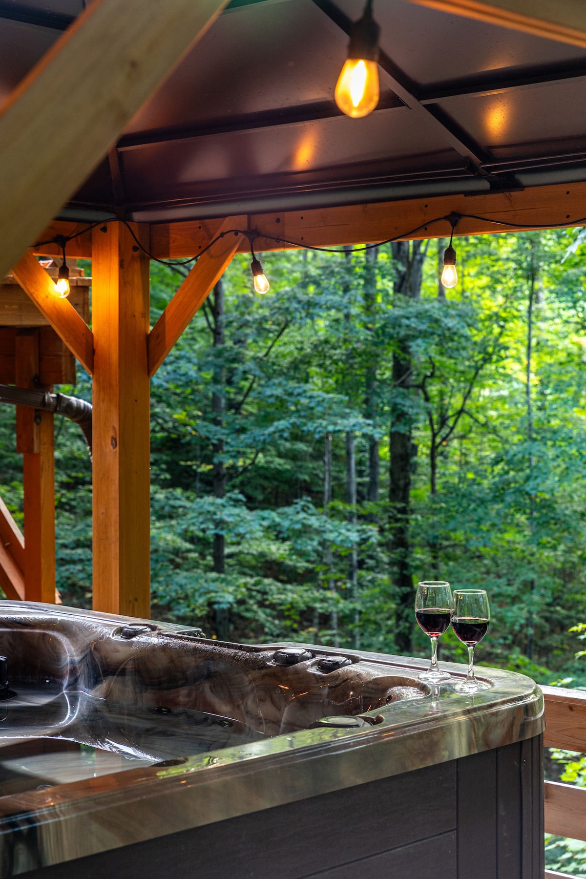 Cabaña privada de madera y piedra en 10 acres aislados, a 15 minutos del centro de Gaylord, del campo de golf Treetops y del Otsego Resort y sus pistas de esquí. Ideal para grupos, invitados a bodas, reuniones, viajes de esquí, fines de semana en vehículos todoterreno, parejas, familias y retiros tranquilos. Capacidad para 20 personas, con jacuzzi, un enorme patio privado, estanque y arroyo, amplios senderos boscosos, juegos y actividades únicos en el interior, y un ambiente divertido y relajante típico del norte. Se aceptan bodas y reuniones familiares con autorización previa. No se permiten fiestas.