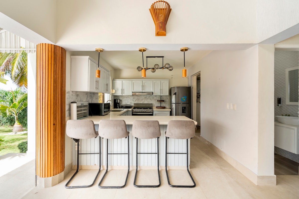 Have fun with Bayshore 76 is a 5 bedroom villa in Palmar de Ocoa beachfront community. A bright and modern spacious villa with a Caribbean touch 3 bedrooms w/king beds, and 2 bedrooms with 2 full beds each. So for 12 guests a perfect beachfront accommodation Of course daily maid included. She comes every morning to clean the house and then end your day at 7 PM Upon request, we have a private chef who can prepare meals for you ($70 per day). You must bring ingredients from the supermarket