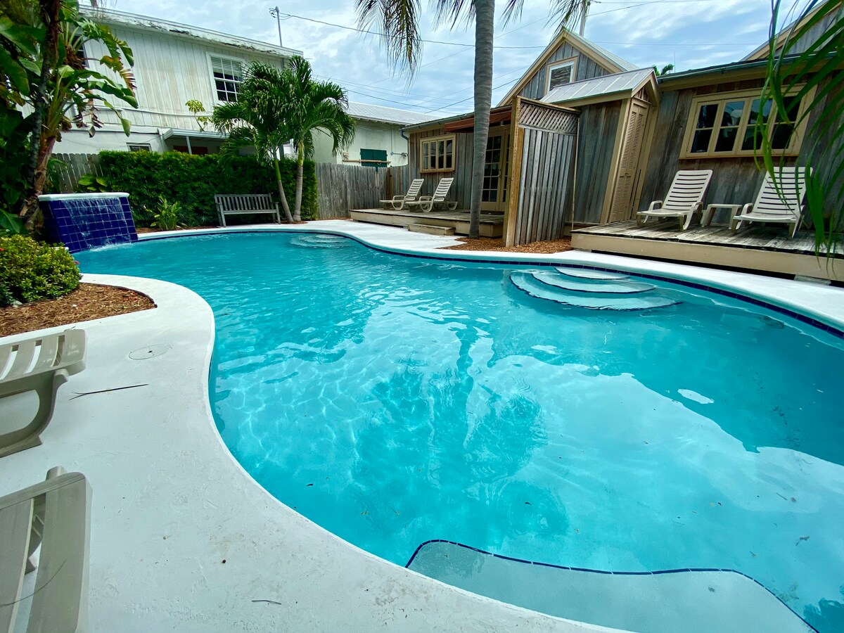 28-night minimum stay rental. Located in a neighborhood 3 blocks from Duval & a short walk or bike ride to Higgs Beach, Southernmost, bakeries, galleries, & Cuban coffee. Cottage has a fenced yard, pool, & two covered porches overlooking the front & back gardens. Our home is on the ground floor of the house. Our full-time tenant lives in a detached studio, accessed by a side entrance & stairs at the rear of the property. Airbnb guests have exclusive use of porches, pool, & deck.