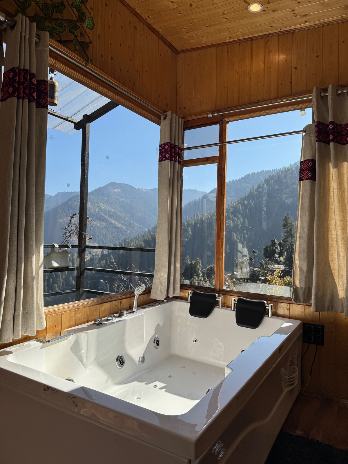 A solo 6 km del mercado principal de Jibhi, esta cabaña de jacuzzi de madera ofrece un refugio tranquilo. Lo más destacado es la lujosa bañera de hidromasaje, 🛁que ofrece unas vistas inmejorables de las montañas circundantes. Es perfecto para relajarse después de un día de aventura, por lo que es ideal para escapadas románticas o escapadas tranquilas. Ya sea que quieras relajarte o explorar, esta acogedora casa de campo garantiza una experiencia inolvidable.