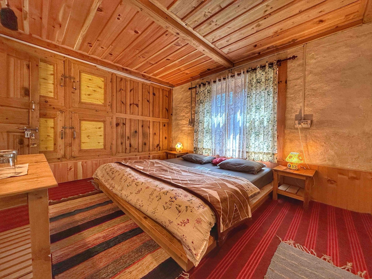 Alójate en una tradicional cabaña de madera himachali rodeada de huertos de manzanas y ciruelas en el tranquilo valle de Sainj. Perfecto para parejas y viajeros solitarios que buscan la tranquilidad de la naturaleza. Disfruta de impresionantes amaneceres sobre montañas nevadas, el canto de los pájaros, hogueras, aire fresco de montaña y comidas caseras locales. Cerca: Cascada de Rupirella (10 km), praderas de Shangarh (15 km), lago Pundrik Rishi (15 km). Nota: No se permiten huéspedes mayores de 50 años.