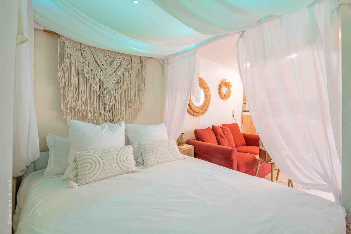 Descubre LA BULLE ROMANTIQUE, tu remanso de paz para un fin de semana en pareja o una escapada romántica. Nuestra elegante y cómoda suite le ofrece un jacuzzi privado para momentos de relajación en total intimidad. Disfrute también de nuestra decoración campestre elegante para un ambiente romántico propicio para la relajación. Ofrecemos desayuno para empezar bien el día. Reserve ahora para una experiencia inolvidable.
