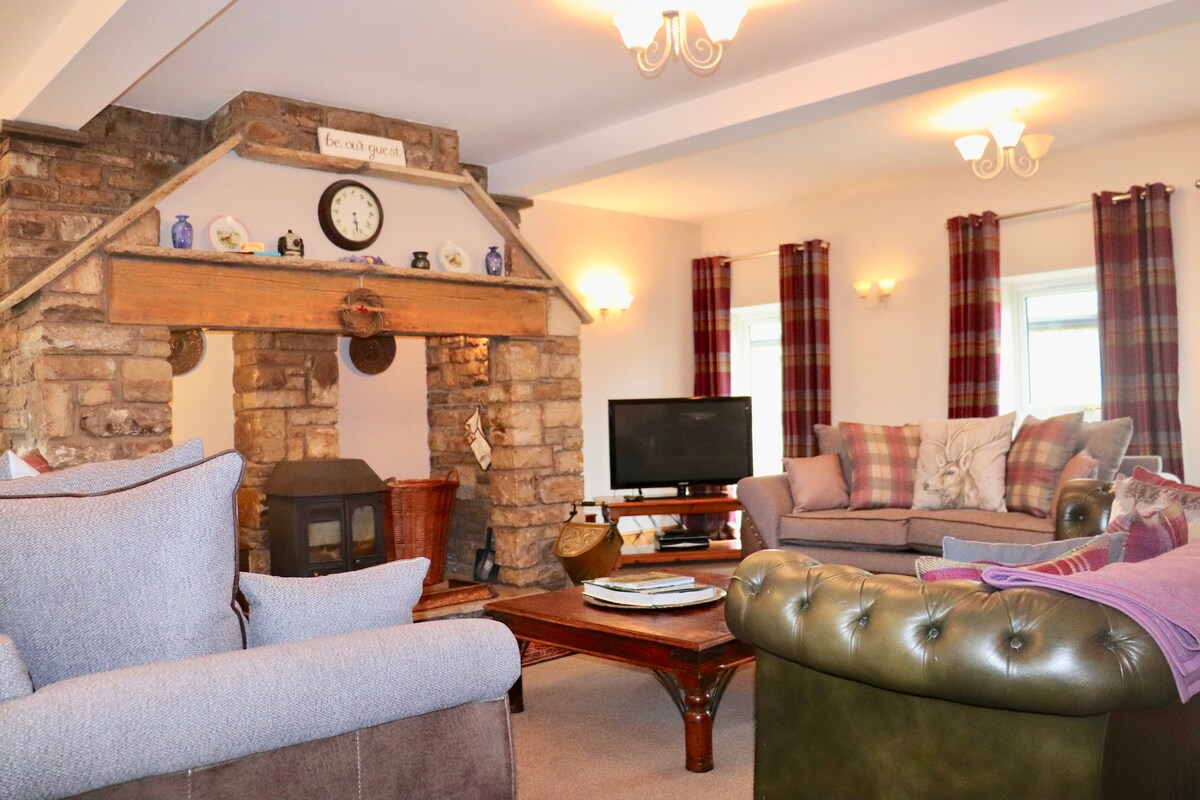 Ideal para familias y reuniones. Tranquilo refugio en la tierra de James Herriot, situado en 9 acres de prado de heno con caballos y ovejas pastando. Date un baño en el bosque mágico o colúmpiate desde el puente. Piérdete en la naturaleza o simplemente disfruta de las majestuosas vistas de los páramos desde tu habitación. Cocina totalmente equipada de estilo rústico contigua al salón. Calefacción por suelo radiante. Radiadores arriba. Cama tamaño king con dosel y baño privado. Otro dormitorio contiguo. Dormitorio con cama tamaño king con baño privado y cocina americana (adecuado para sillas de ruedas).