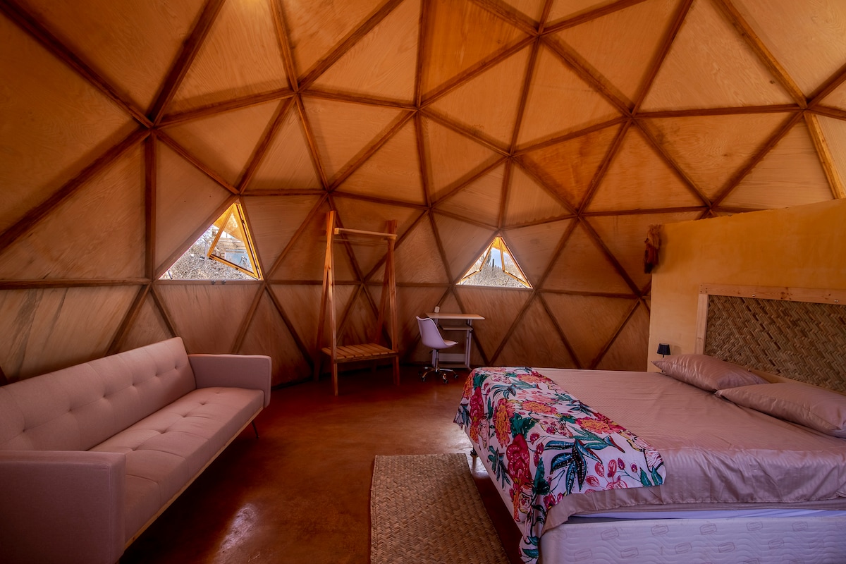 Conecta con la naturaleza en esta escapada inolvidable. Déjate llevar por la calma del desierto y la brisa de mar. El domo se encuentro en un espacio ecológico llamado “Espacio Amor”. Quédate dormido contemplando las estrellas y por el sonido de la calma. La habitación cuenta con una cama queen size memory foam muy confortable. Tiene cocina propia (aparte de la compartida qué hay en el espacio). Cuatro maravillosas perritas te recibirán cuando llegues y te acompañarán en tu estadía
