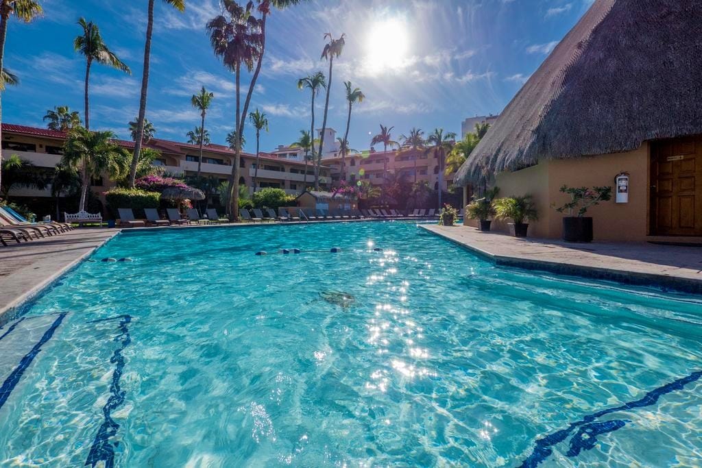 Welcome to our Beautiful penthouse condo, your Casa in Cabo! . Enjoy the pool and courtyard views from private balcony with BBQ. Living (smart tv) and dining areas great for entertaining. Fully equipped kitchen. 16 ft vaulted ceilings. MBR: full bathroom, one king size bed and one full size bed, smart tv. SBR: Two twin beds, arranged as a king size if needed, full bathroom. Laundry area. Condo perfect for couples, friends, and families..Mi Casa su Casa!