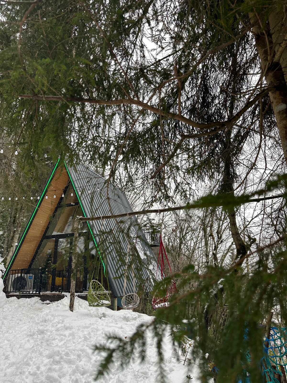 Cabaña en forma de A inmersa en la naturaleza de Guria, a pocos metros del río y en el camino a la montaña Gomi. Cocina exterior, toilette y ducha de bambú caliente. Aparcamiento gratuito, Wi-Fi, actividades al aire libre y compartir espacio abierto social.