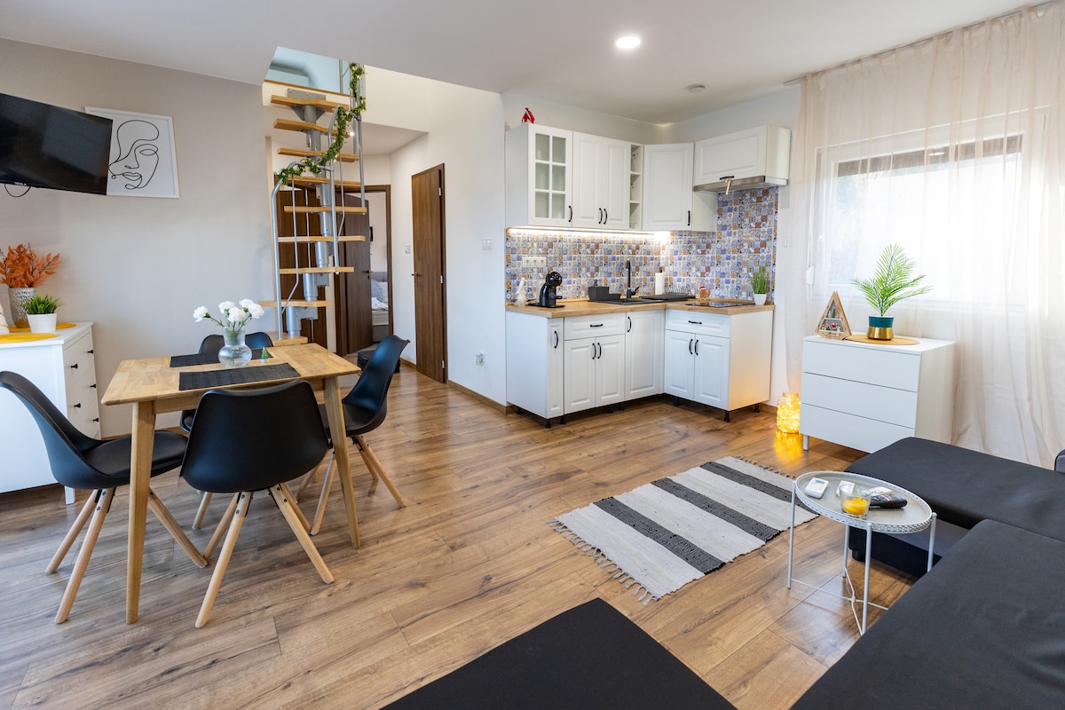 Ofrecemos nuestros elegantes apartamentos en un edificio de apartamentos de nueva construcción en la ciudad jardín de Veszprém, a 8 minutos en coche del centro. Aparcamiento gratuito en el patio. Este apartamento también cuenta con una sauna de infrarrojos. Hay una cama doble grande en el dormitorio y un sofá cama en el salón. Ideal para 2 adultos + 2 niños. En el patio hay un jacuzzi climatizado, que los huéspedes de nuestros tres apartamentos pueden utilizar de forma ilimitada.