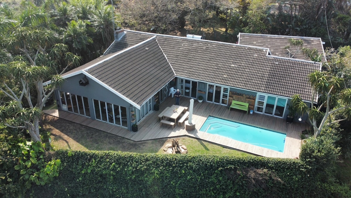 Casa de playa familiar de cinco dormitorios, espaciosa y apta para mascotas, y casa de campo adicional de 1 dormitorio con jardín. Los jardines son extensos y exuberantes, con acceso directo a una playa aislada con piscinas de roca para nadar o pescar. La casa está enclavada en un lote excepcionalmente hermoso de bosque costero. Esta posición única ofrece a los huéspedes total privacidad, pero la ubicación está a 7 minutos en coche del aeropuerto King Shaka, las ciudades costeras Ballito y Umdloti que tienen magníficos centros comerciales y restaurantes.