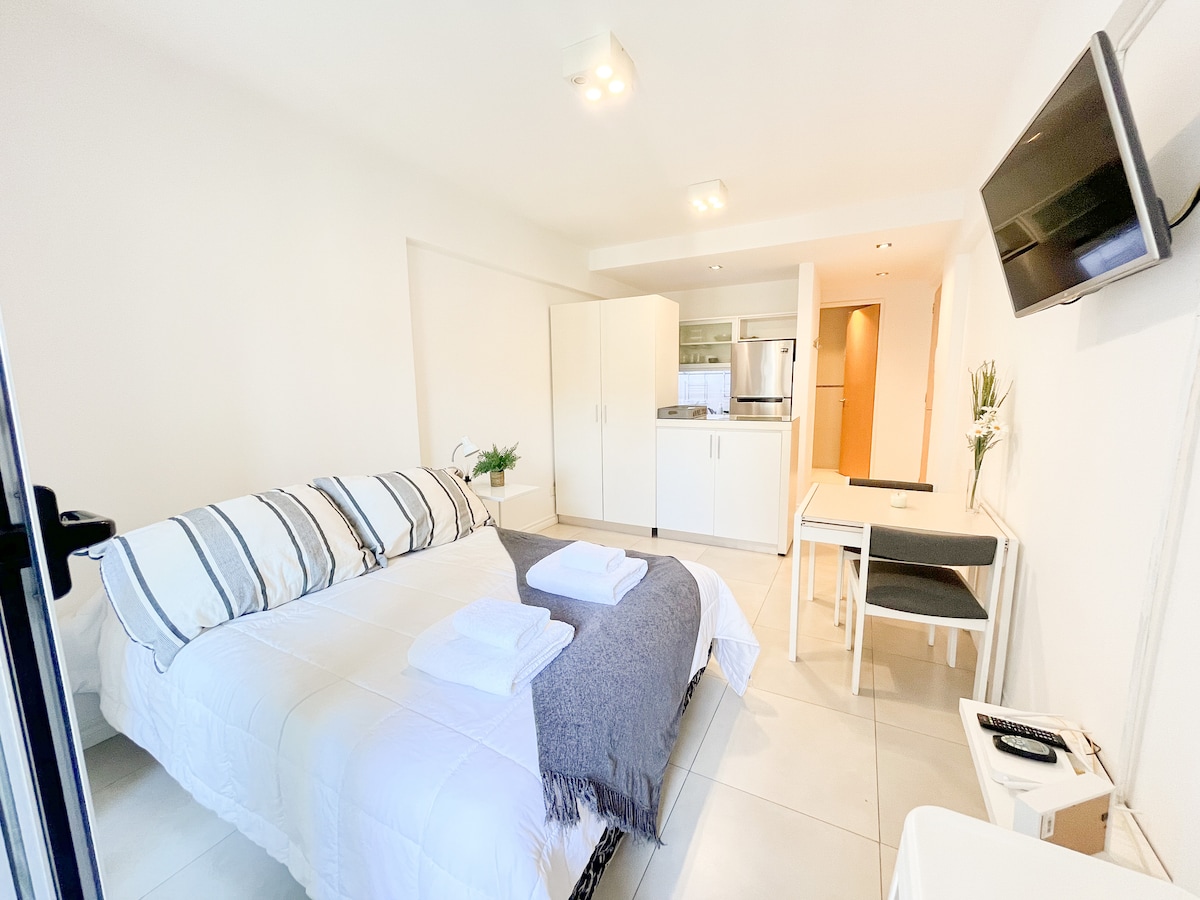 Amplio studio luminoso equipado y pensado únicamente para huéspedes de cortas y largas estadías. El depto cuenta con wifi 300 megas apto para uso profesional (trabajo remoto) una cómoda mesa para trabajar, cenar, almorzar al igual que la barra y/o desayunador. Tv smart con cable y disponible para usar netflix con tu cuenta. Dos opciones de cortinas en el dormitorio, black out (oscuridad total) y screen (translucidas) balcon amplio con mesa y sillas para almorzar/cenar o trabajar al aire libre!