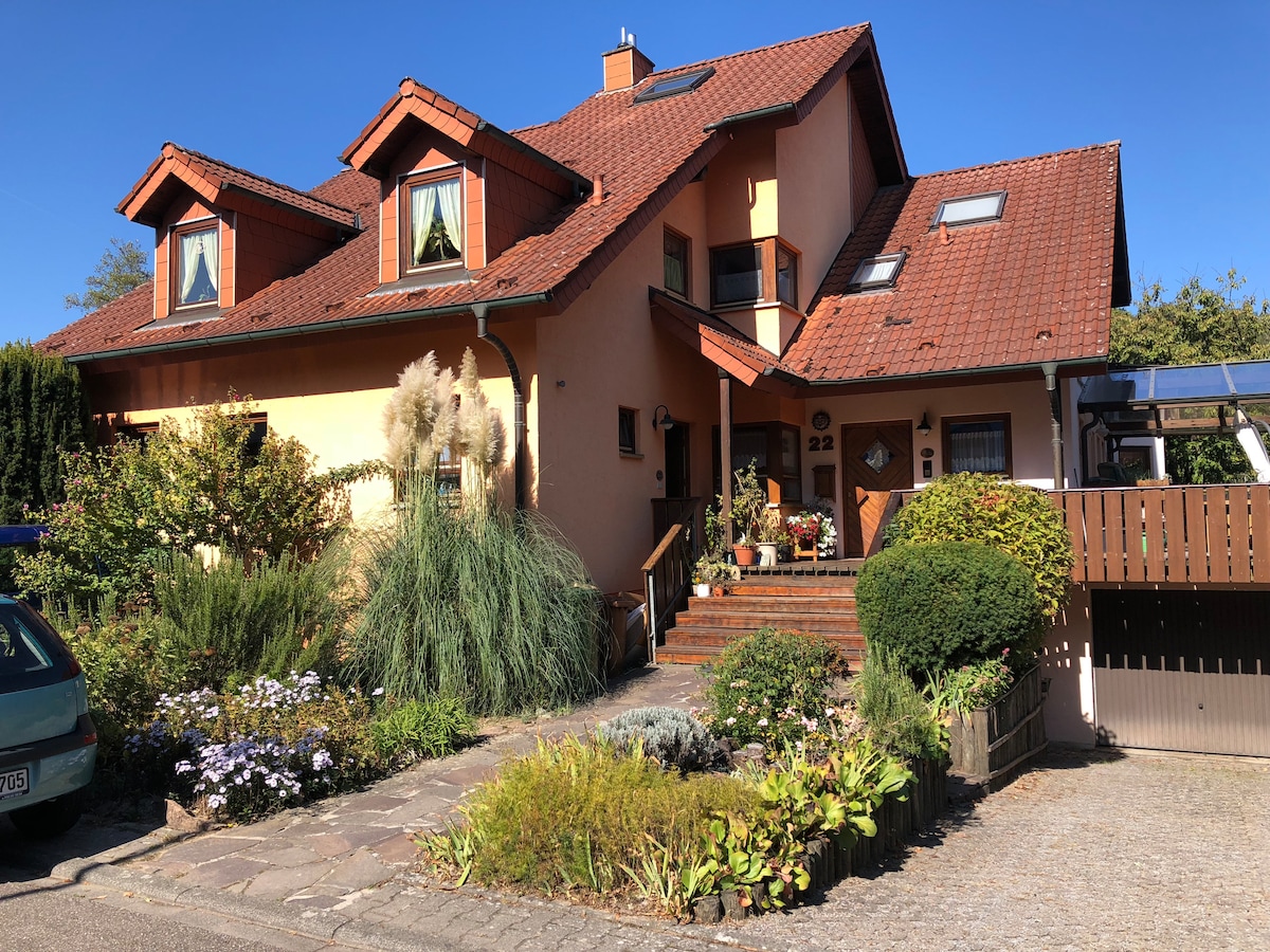 Casa con apartamento en planta superior de 70 m² completamente renovado y con unas vistas maravillosas. El apartamento es luminoso, moderno y acogedor. El apartamento dispone de lo siguiente: - Cocina equipada - Baño con bañera - 1.º dormitorio con cama boxspring 140x200 - 2º dormitorio con armario y cama individual - Sala de estar con sofá cama, mesa de comedor y balcón Simplemente disfrutar de las vacaciones: - Relajarse - hacer senderismo por los bosques caducifolios - ir de compras y hacer turismo en Heidelberg - visitar los lugares de interés del valle del Neckar