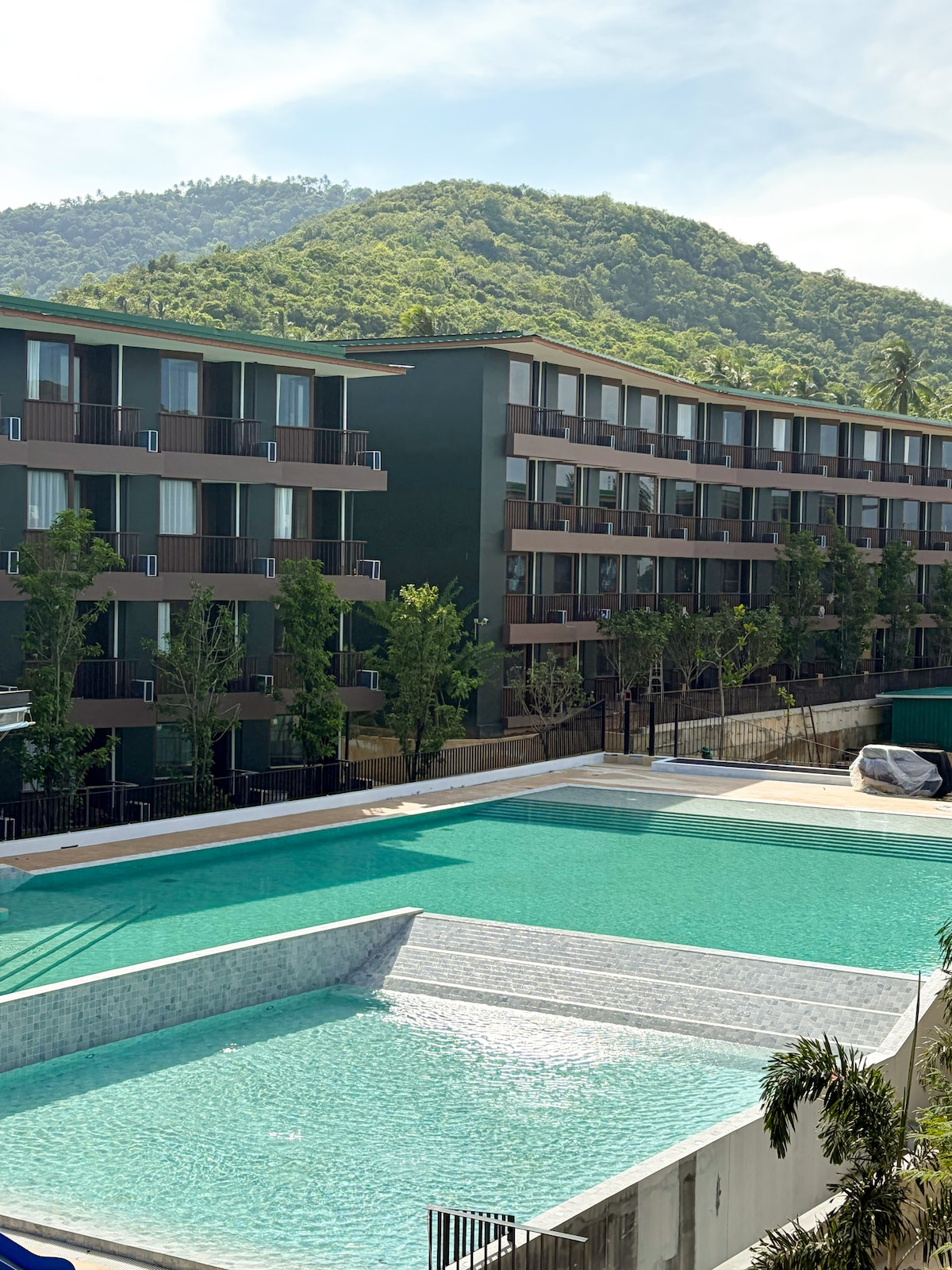 Vuelve a conectarte con tus seres queridos en este lugar apto para familias. Nuestro dormitorio privado y 1 sala de estar. La habitación está en el tercer piso con vistas a la piscina. Puedes caminar fácilmente hasta la playa y el pueblo de pescadores. - Tamaño de la habitación 53 metros cuadrados. - Cama tamaño king. - Balcón. - Vista a la piscina - Ducha de agua caliente. - Refrigerador. - Wi-Fi. - TV inteligente, Netflix tanto en el dormitorio como en la sala de estar. - Microondas. - Cocina - Lavadora. - Piscina, piscina para niños, área de juegos para niños, cancha de baloncesto, cancha de tenis, gimnasio.