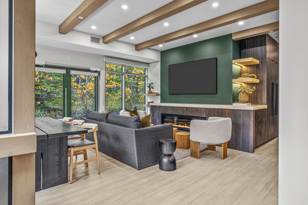 ¡Bienvenido a su tranquila y elegante escapada a Canmore! Este lujoso apartamento está a solo 10 minutos a pie del centro de la ciudad, por lo que las tiendas, los restaurantes y los senderos están a la vuelta de la esquina. Relájate junto a la acogedora chimenea de piedra, descansa en una lujosa cama tamaño king o recibe a invitados adicionales en el sofá cama de alta calidad. Disfruta de un espacio luminoso y amplio, cocina totalmente equipada, lavandería en la suite, aparcamiento gratuito y wifi de alta velocidad de 1 GB. Ideal para la aventura o el relax en las Rocosas.