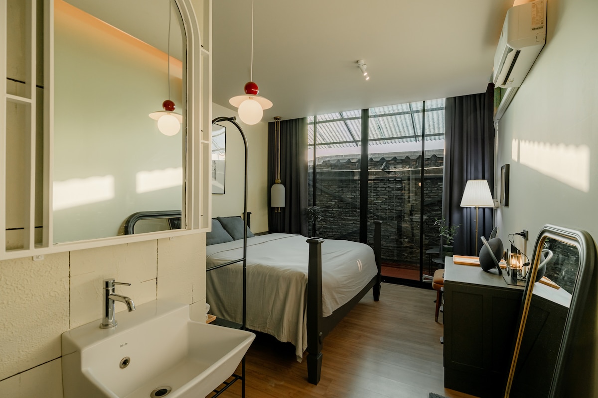 Esta es una habitación privada de 13,5 metros cuadrados, tiene 1 cama tamaño queen y baño privado (integrado). Pantalla plana y aire acondicionado. Renovamos nuestro alojamiento de una antigua casa china. La decoración interior está inspirada en el estilo de vida tailandés-chino local. El edificio tiene 2 plantas con balcón adicional en la azotea. Nuestra ubicación está en el barrio chino, a unos 100 metros de la estación de Wat Mongkhon (MRT). El nombre del edificio es Live Local Yaowarat Cafe & Hotel.