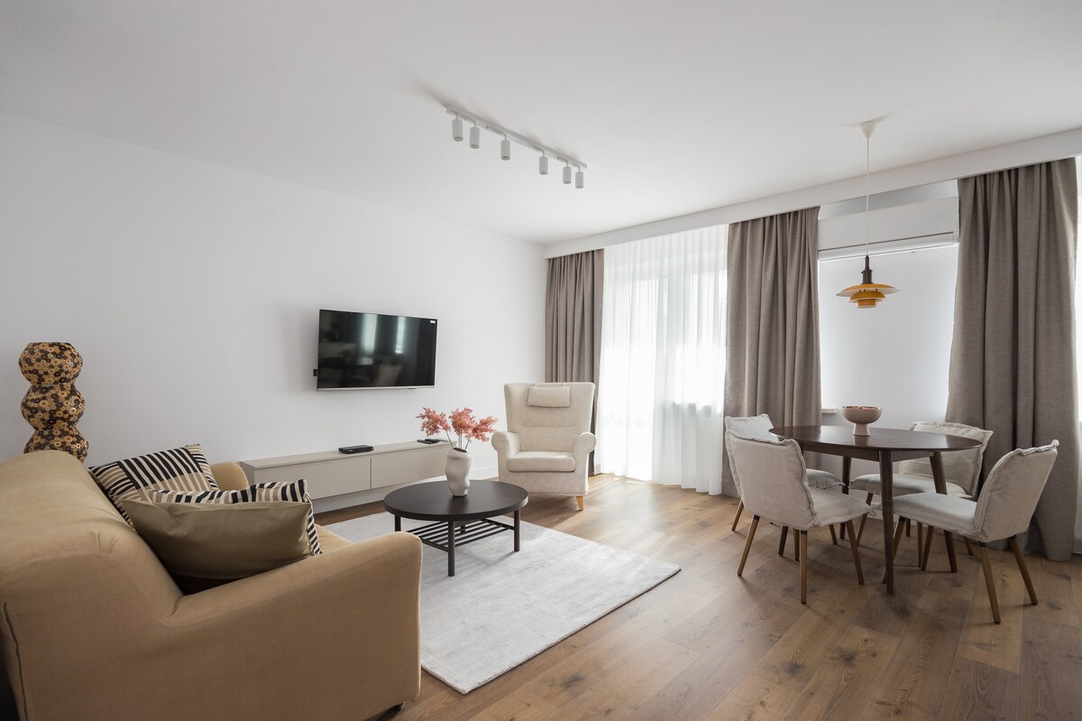 Diseñado en un apartamento de alto nivel, totalmente equipado y acogedor en un prestigioso distrito tranquilo. Televisión (noticias en inglés, francés, etc.), wifi de alta velocidad gratuito, lugar de estacionamiento en el garaje y un gran balcón :) Cocina americana totalmente equipada. Cafeterías, restaurantes, gimnasio 24/7 y supermercado cercanos. Ideal para parejas, familias con hijos o viajeros de negocios. Siéntete como en casa :)
