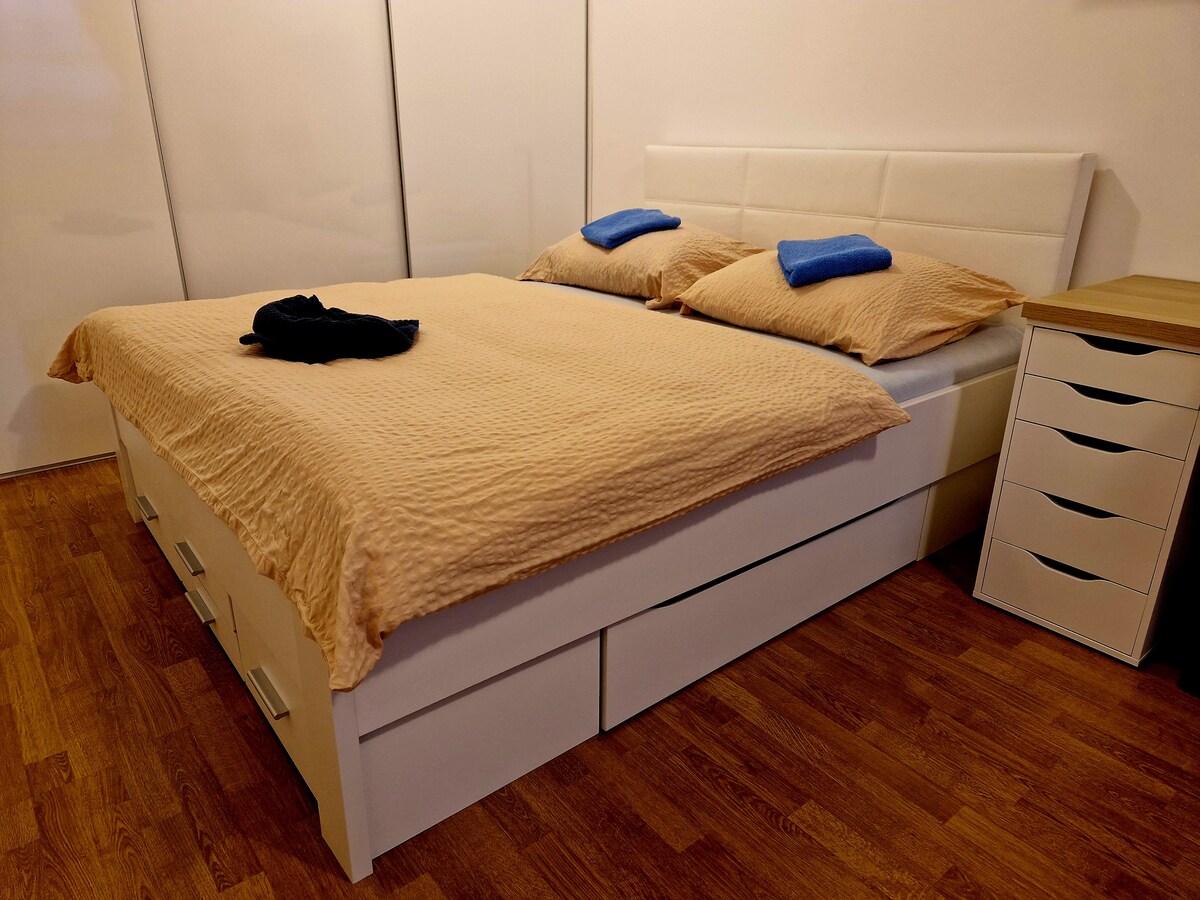 Departamento moderno en Trenčín: ¡comodidad, privacidad y excelente ubicación! Disfruta de tu estancia a solo 1 km del centro de Trenčín, cuya parte principal comienza en la plaza Mierov directamente debajo del icónico castillo de Trenčín. ✔ 2 - 3 habitaciones (2 dormitorios conectados con una cama doble grande de 180/200 y la segunda de 140/200, sala de estar con sofá cama, cocina con electrodomésticos incorporados, 1 baño con inodoro. Cuna para un niño de hasta 2 años aproximadamente. Aparcamiento privado reservado GRATIS justo en la entrada.