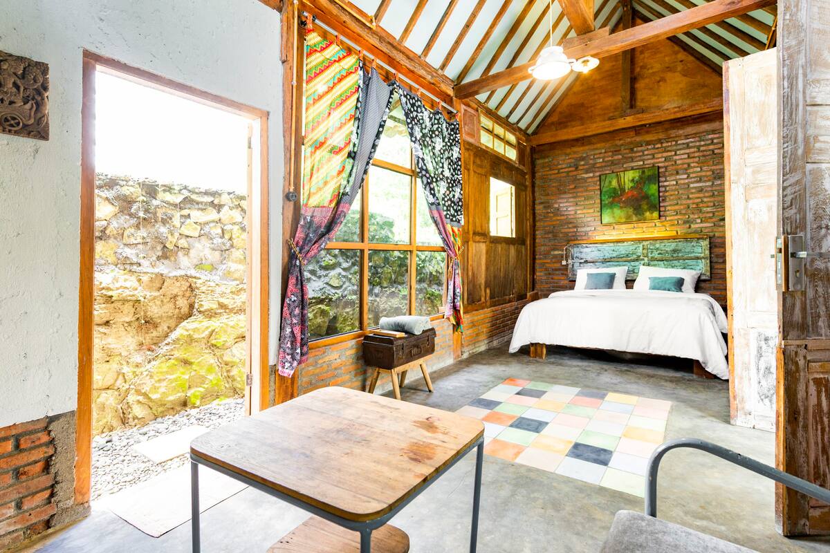 Unique fusion of the Limasan, a traditional Javanese architecture with modern design, unfolds an eclectic yet authentically grounded experience. The villa offers an intimate sanctuary, lush garden, a breezy patio, and thoughtfully designed interiors that whisper calm amid greenery. Just beyond the city's reach, Krebet Village invites you to slow down. In its quiet pace, you’ll rediscover simplicity, presence, and what’s often overlooked in our busy lives.