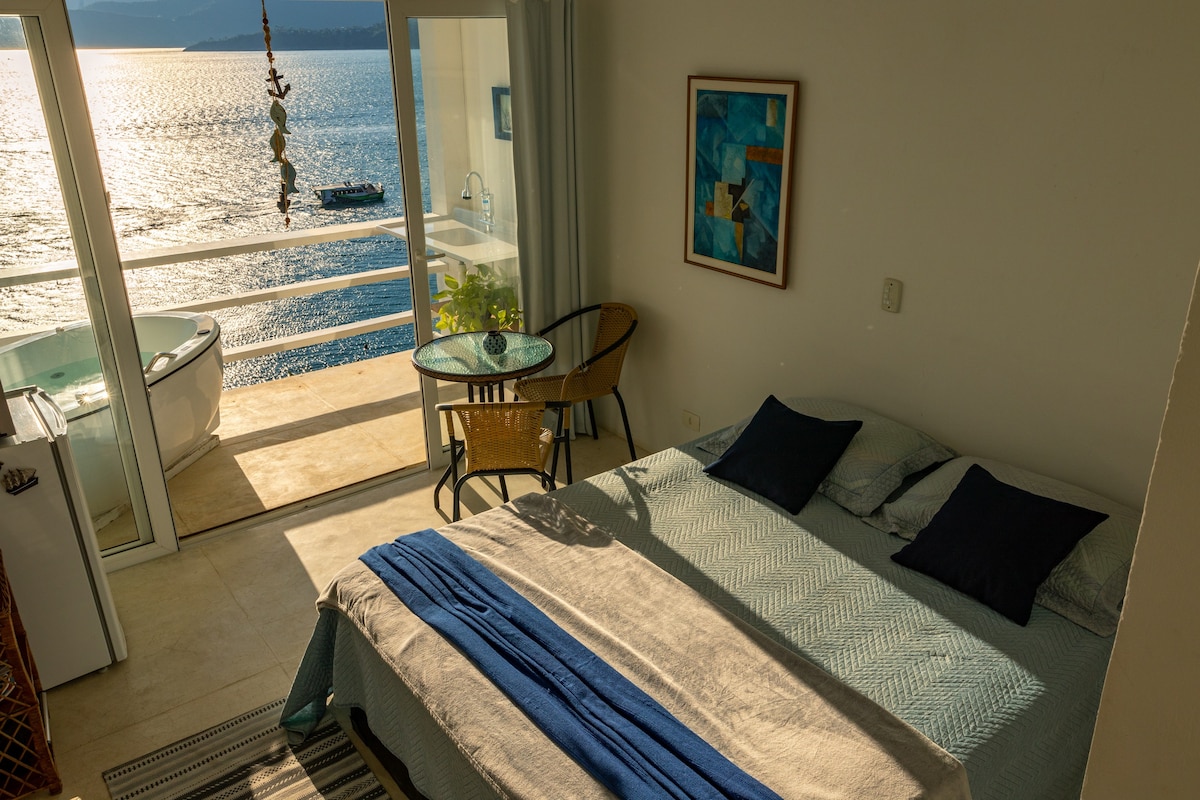 Magnífica vista a 80 metros de la playa de Curral, una de las más bellas y de moda de Ilhabela. CHALET para hasta 3 personas con dormitorio doble, sala de estar, cocina americana y balcón con vista al canal, ¡lugar perfecto para admirar una hermosa puesta de sol! Internet Wi-Fi, Smart TV 32" con NETFLIX, aire acondicionado en el dormitorio, cocina equipada con nevera, estufa, microondas y utensilios varios. ¡Gran relación calidad-precio! Nota: El acceso a las cabañas es por escalera / Se permiten mascotas pequeñas.
