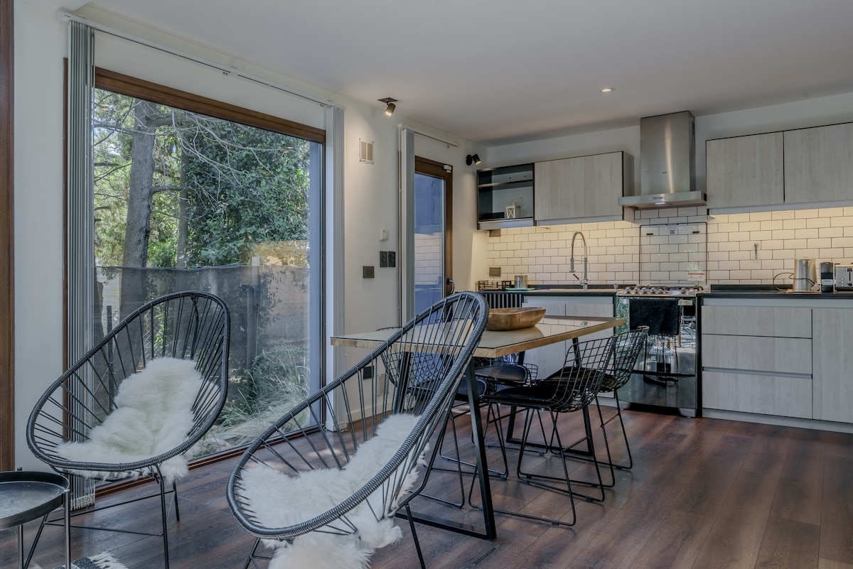 El encanto de esta casa está inmediatamente al entrar en este espacio moderno lleno de vida, bañado por el sol y la luz. El salón, el comedor y la cocina totalmente equipada comparten un espacio completamente abierto con impresionantes vistas al lago Nahuel Huapi. La terraza de madera es el lugar perfecto para disfrutar de una magnífica puesta de sol patagónica. NO HAY PROTECCIÓN PARA BEBÉS/NIÑOS EN LAS ESCALERAS INTERIORES NI EN LAS DOS TERRAZAS EXTERIORES.