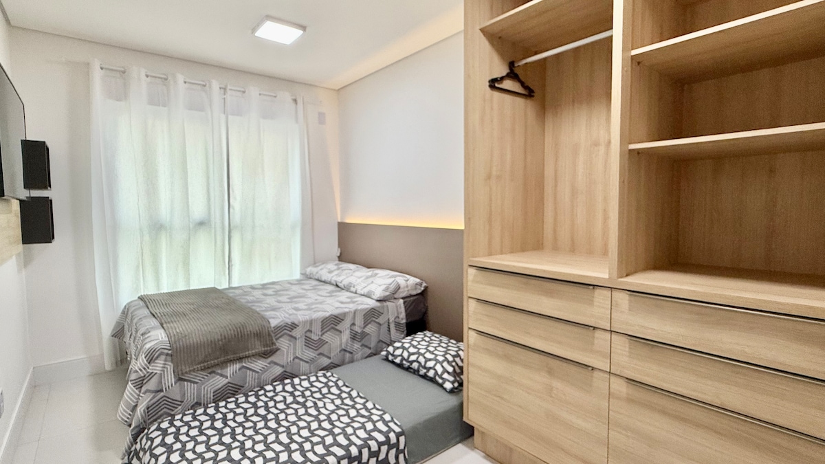 Hermoso apartamento a pie de playa con acceso exclusivo a la playa. Ofrece comodidad para hasta 5 personas, totalmente equipado con un estilo moderno y único. Gran ambiente familiar con muchas opciones de ocio: Piscina infinita y jacuzzi Piscina infantil Bar húmedo Piscina termal Solarium Sala de juegos Sauna Estudio de Fitness y Pilates Pistas deportivas Cine Espacio Kids y Playground Espacio Gourmet y Salón de Fiestas Espacio Pet Estacionamiento Acceso al Parque Beto Carrero en 15 min. Se admiten mascotas