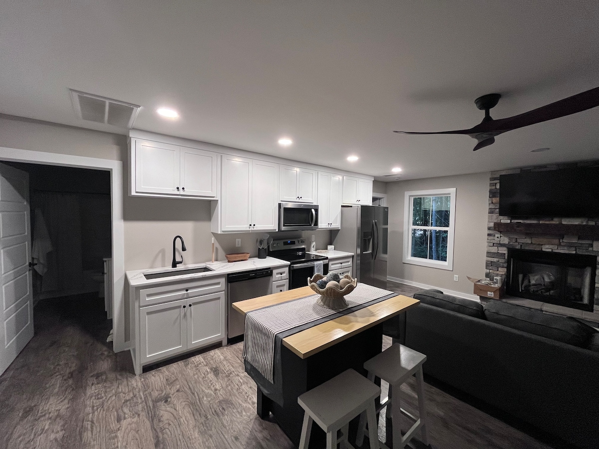 Relájate y desconecta en este alojamiento tranquilo y elegante. Cabaña a estrenar en el bosque en Barren River Lake. Aproximadamente a una milla de la rampa para botes de Port Oliver (¡la mejor rampa de Kentucky!) Acogedora habitación con cama tamaño king, 1 baño, cocina completa, bien surtida. La cabaña tiene una sala de estar abierta con chimenea de gas y sofá cama tamaño queen. Excelente wifi, TV en el salón y el dormitorio. Lavadora y secadora. Enorme envolvente alrededor del porche que añade un gran espacio al aire libre. ¡En verano, una bonita escapada arbolada! ¡En invierno, vistas al lago! Fogata.