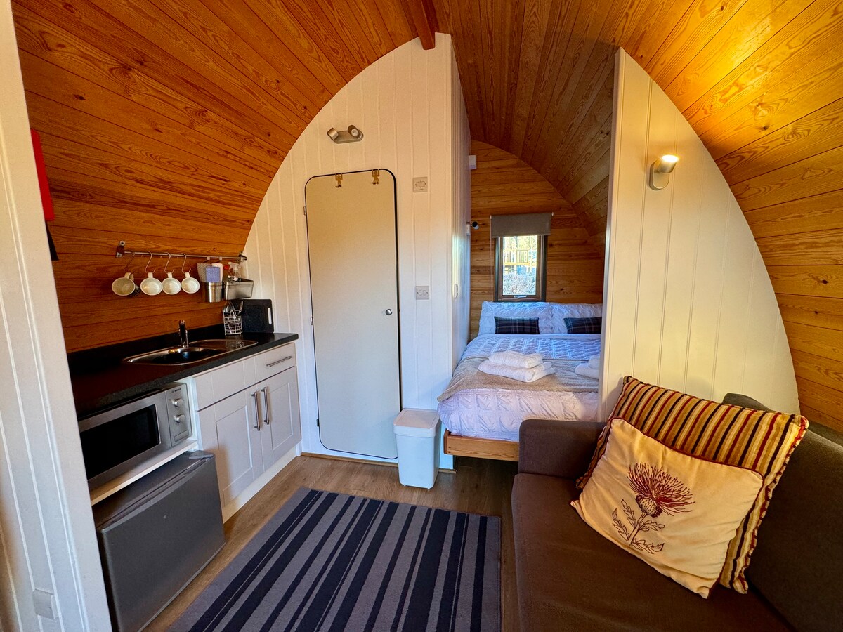 El Galloway Luxury Lodge Pod con jacuzzi eléctrico para 2 personas se encuentra entre las colinas de Carrick en South Ayrshire, suroeste de Escocia. Características: Ducha, lavabo e inodoro en suite Cama doble fija Ropa de cama y toallas (2 por persona) Sofá cama grande Cocina pequeña con nevera, microondas, hervidor de agua, tostadora y fregadero. Cubertería y vajilla. Mesa de comedor y sillas. TV de pantalla plana/DVD Enchufes eléctricos con puntos de carga USB. Aislamiento bajo cero y calefacción por suelo radiante para que estén cálidos y acogedores.