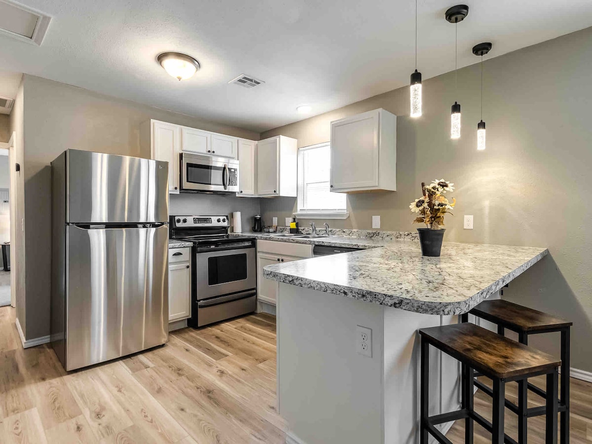 Apartamento recién reformado en el centro de la ciudad. Cerca de todo lo que Bartlesville tiene para ofrecer. ¡Junto con Pioneer Woman! A poca distancia a pie del centro comunitario y de Tower Green. Esta unidad está arriba, 1 tramo de escaleras interiores. Incluye: • Aire acondicionado/calefacción central • Televisor de 43 pulgadas en el dormitorio con aplicaciones inteligentes. • TV de 55 pulgadas en la sala de estar con aplicaciones inteligentes • Ventiladores de techo. • Lavadora secadora • Lavavajillas. • Cocina/horno • Ollas y sartenes. • Tazas y platos. • Cafetera. • Reloj. • Wifi • Horno microondas • Nevera • Armarios y perchas. • Cámaras de seguridad exteriores