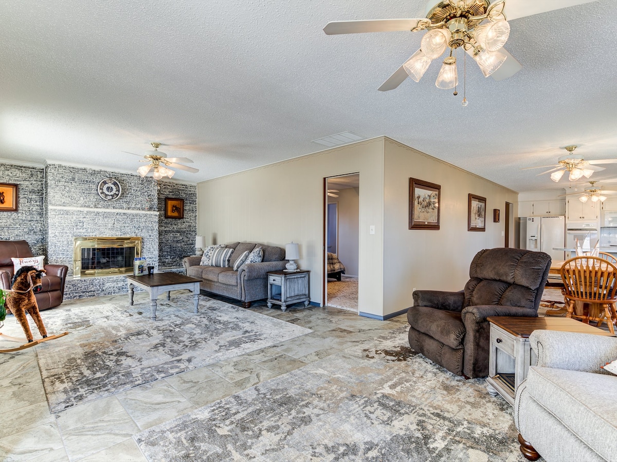Despiértate con los Longhorns pastando fuera de la casa de tres dormitorios de tamaño generoso con múltiples áreas de estar interiores y exteriores. Esta original casa de campo familiar está asentada en 75 acres. ¡Perfecta para una escapada de fin de semana! Ubicado a solo 10 minutos del centro de Bartlesville y a 40 minutos de Pioneer Woman Mercantile. Retrocede en el tiempo y disfruta del ambiente del salvaje oeste. La casa ha sido equipada con diseños vaqueros de lujo por Yocham's Custom Leather & Cowboy Decor.