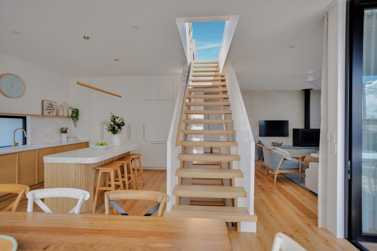 Adéntrate en este lujoso alojamiento junto a la playa en el Upper Loft de 19W. Despiértate con unas vistas espectaculares al mar, disfruta del desayuno en el amplio balcón y cuéntalo con la refrescante brisa marina. Situado entre el famoso puente de Barwon Heads y la calle principal, el Upper Loft está tan cerca de las maravillas naturales de Bluff y de los hermosos senderos para caminar como de los mejores restaurantes, tiendas, pubs, mercados y campos de golf de la ciudad. Estarás perfectamente ubicado para aprovechar al máximo tu escapada junto al mar.