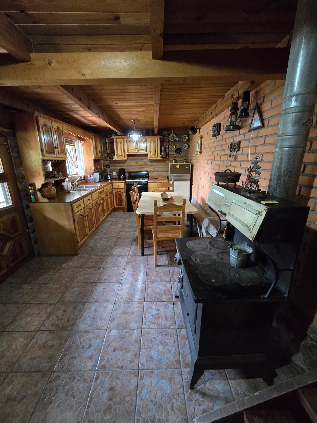 El departamento es tipo cabaña con techo de dos aguas, tiene un mezzanine donde esta ubicada la 2a.habitación, cocineta con estufa que inc. horno, refrigerador y los trastos elementales para cocinar,una mesa con ocho sillas y dos sillonsitos, que hacen las veces de un recibidor, la decoración de de tipo campestre. Nuestra forma de calefacción es un calentón de leña, un calentón a gas y un calentón eléctrico (para el baño).