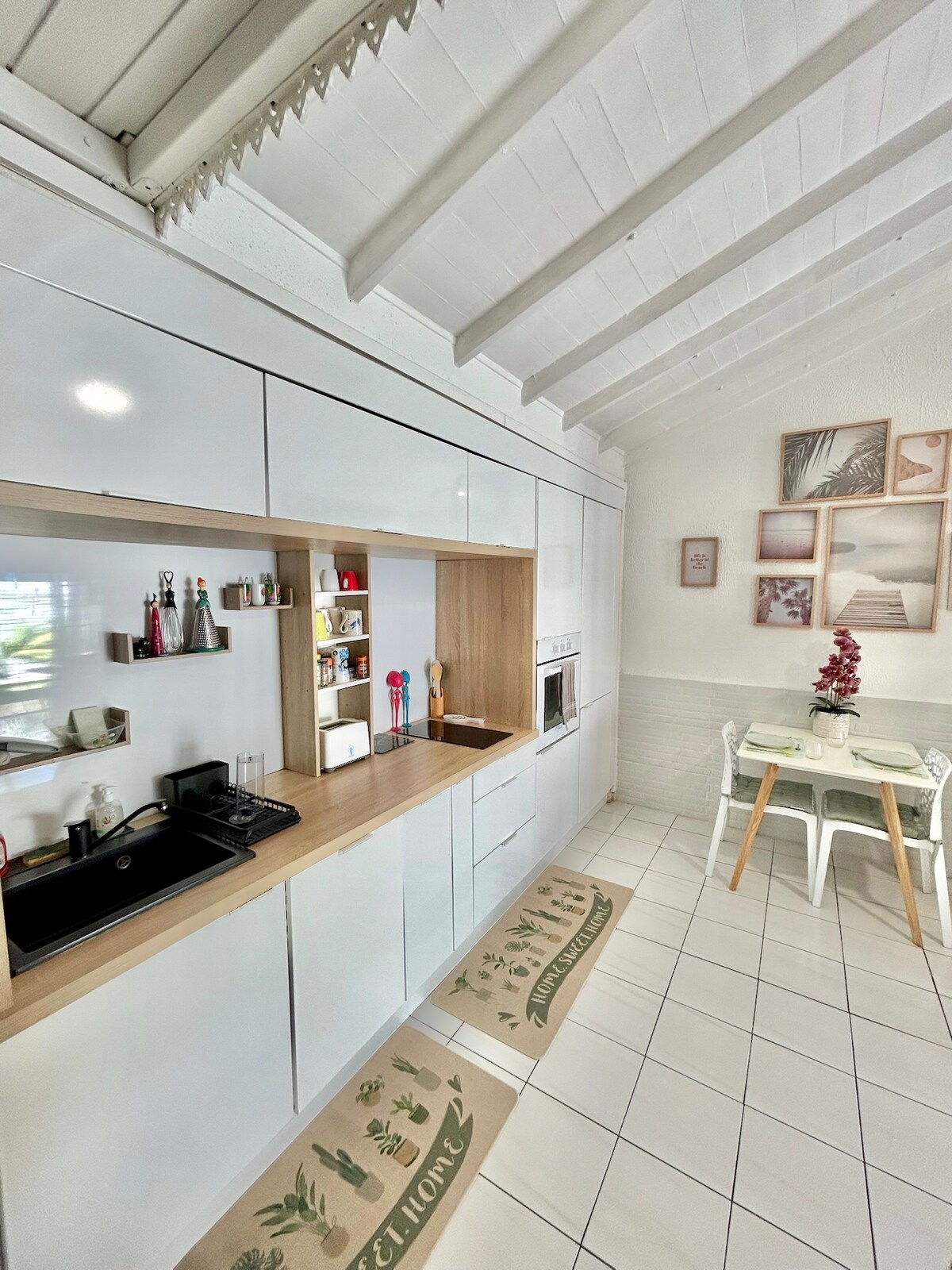 Parte baja de villa de 90 m2 totalmente vallada con entrada individual, que consta de una gran terraza. El alojamiento equipado con ventiladores y mosquiteras incluye: sala de estar, cocina equipada, 2 dormitorios, uno con una cama de 140 y una cama de 90 y el otro con una cama de 140, baño con ducha italiana, 2ª ducha y aseo exterior. A 5 minutos en coche de la playa de Malendure, reserva Cousteau. A su llegada se le servirá un aperitivo y se le ofrecerá el primer desayuno.