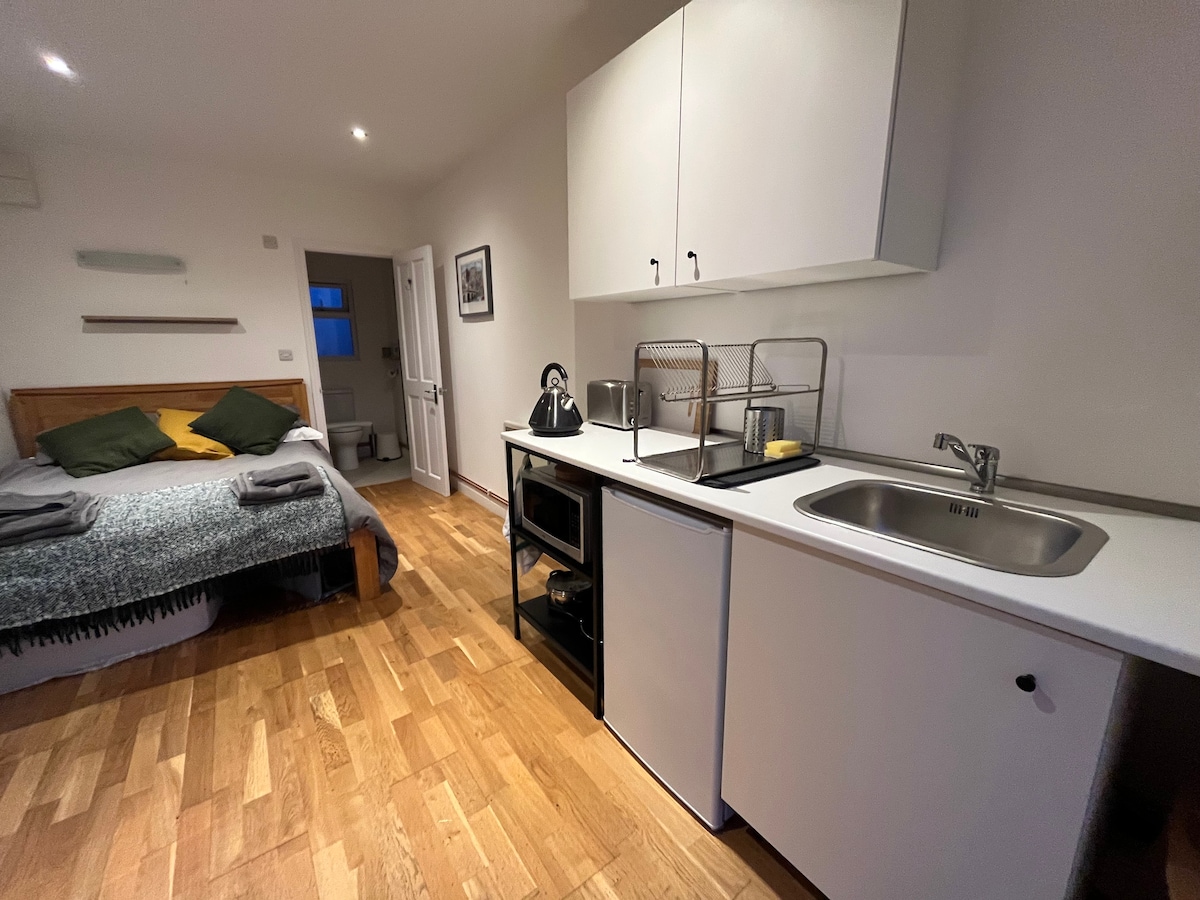 Una habitación acogedora, cálida y romántica para parejas, aventureros solitarios y viajeros de negocios. TEN EN CUENTA que los escalones estrechos conducen a la puerta principal privada, que pueden no ser adecuadas para personas con problemas de movilidad. Hay una estufa de leña instalada. El baño es de estilo contemporáneo con ducha eléctrica, lavabo e inodoro. Hay una pequeña zona separada para hacer té y café con una nevera, tostadora y microondas. Si no está disponible, revisa nuestro otro apartamento.