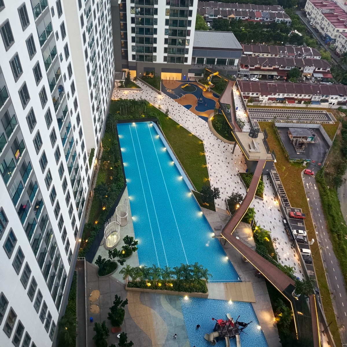 La casa de familia tiene 2 camas tamaño queen y 1 cama de dos pisos, totalmente climatizada, una gran piscina, una sala de sauna, un gimnasio moderno y wifi de 300 Mbps. 2 Estacionamientos residenciales GRATUITOS. Está a unos 2 minutos en auto de varios restaurantes, tiendas de comestibles, gasolineras y el centro de la ciudad de Kuala Lumpur a solo 20 minutos.