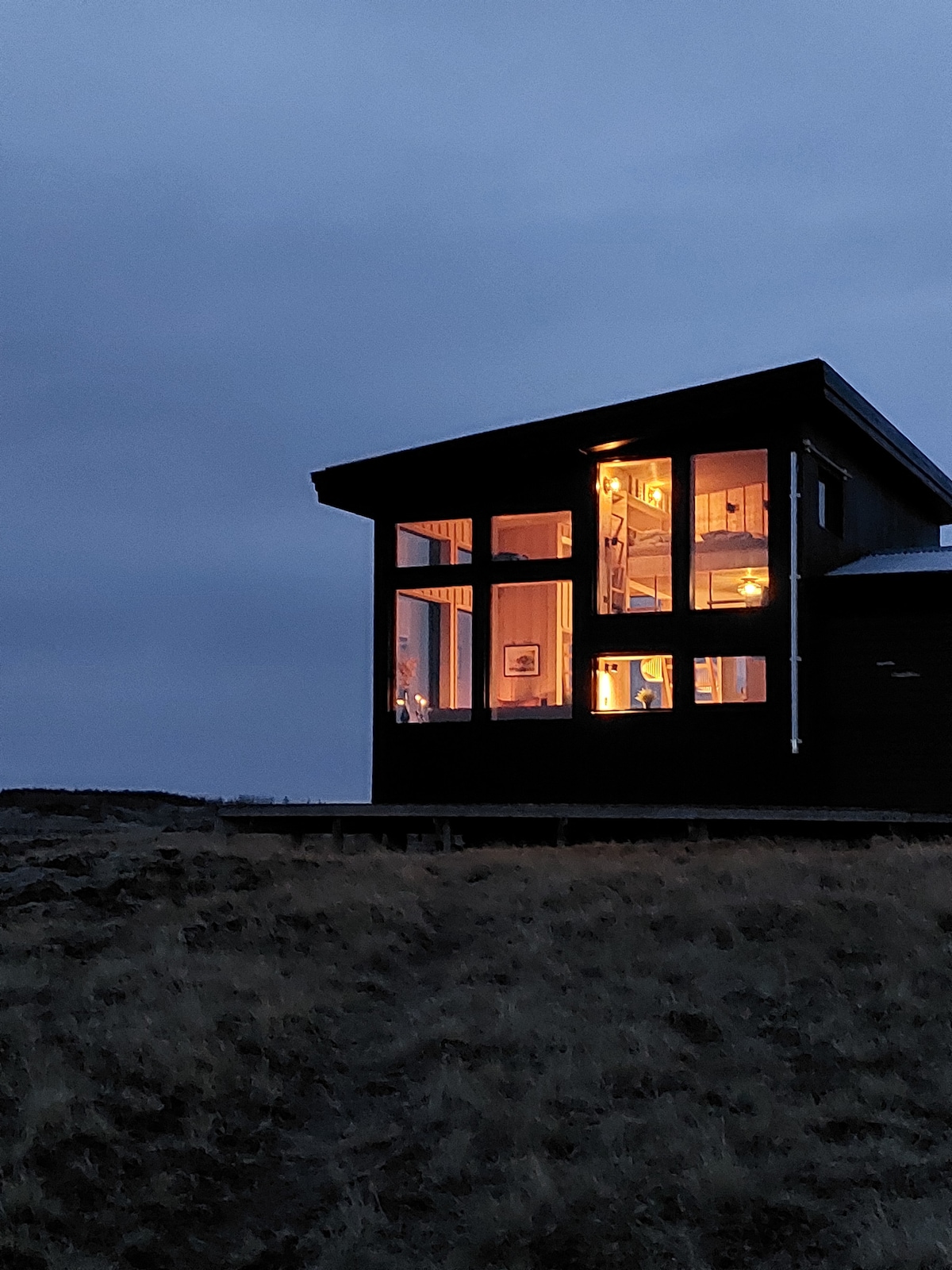Wooden, warm house for six people. Perfectly integrated into the lava field at the foot of the extinct GRABROK volcano, which you can enter almost straight from home :). Beautiful views and silence. Only the sounds of nature can be heard. An ideal place to observe the northern lights (no city lights). Just 300 meters from the main road No. 1. Fully equipped kitchen. Perfectly clean drinking water flows from the tap. The jacuzzi is already working :) There are bubbles and it's nice :) !!!