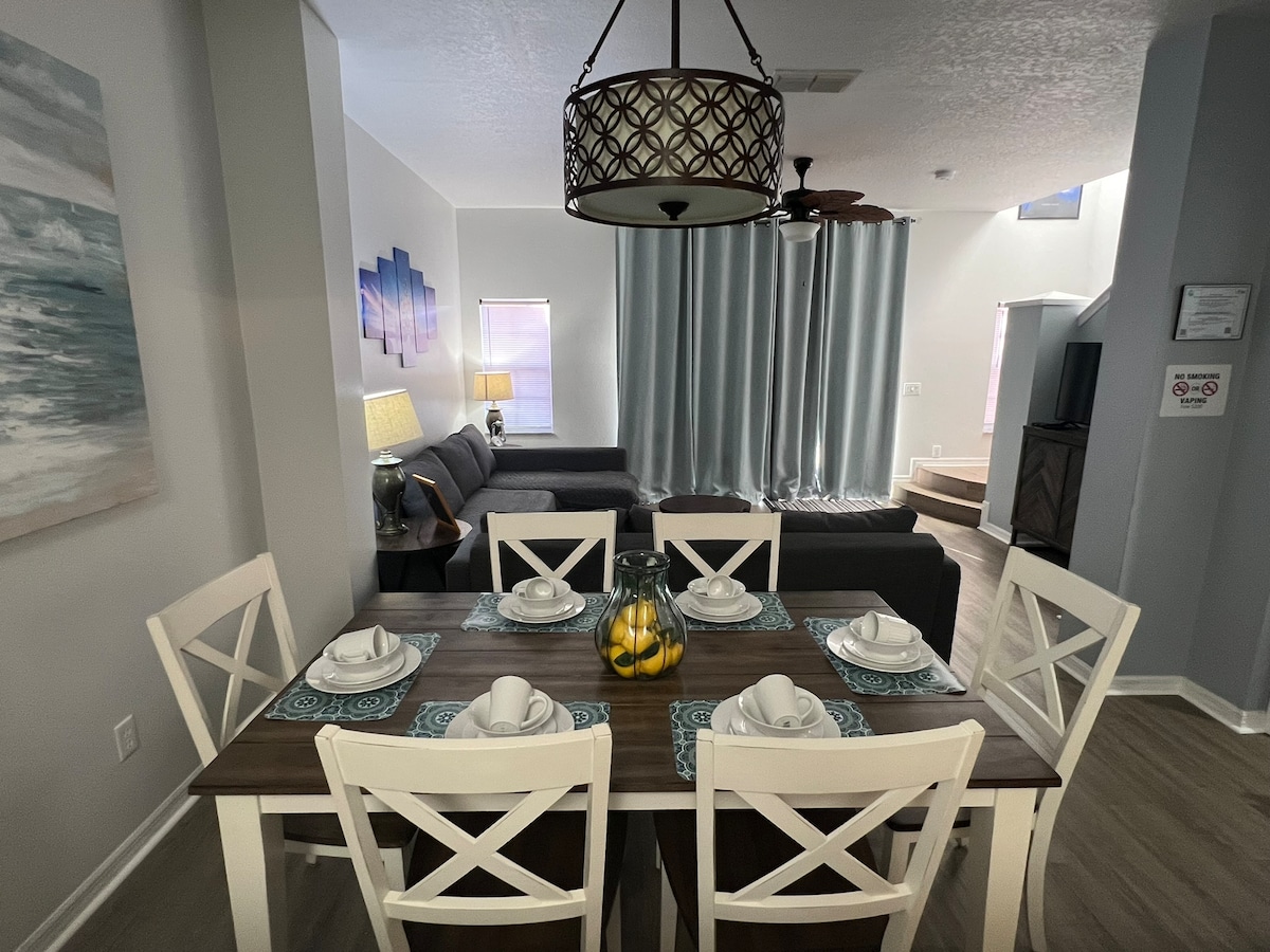- Sin tarifas de servicio de Airbnb. - ¡Descuentos semanales y mensuales! - Casa adosada de 3 dormitorios y 3 baños ubicada en el corazón de Disney. Comunidad cerrada, piscina, gimnasio. - Propiedad de Disney (13 minutos), Disney Springs (20 minutos), Universal Studios (25 minutos), Sea World (24 minutos), Centro de Convenciones (17 minutos). - A 5 minutos de tiendas, atracciones y restaurantes. - Mantenimiento profesional para ofrecerte a ti y a tu familia la mejor experiencia de servicio al huésped. - Sala de cine. - Televisor de pantalla plana de 75 pulgadas. - Totalmente equipado con todos los elementos básicos.