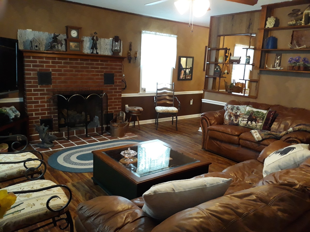 Jim and Kathi have created a welcoming Little Country Inn on their mini farm. The Western theme lends a warm welcome and comfortable space for guests. The lovely 2-bedroom brick cottage boasts a spacious living area with high-speed Wi-Fi, a Roku TV in the living room and main bedroom, and a large country kitchen. The inn sleeps five people, and the large fenced-in yard is a perfect place to relax and enjoy the country sounds of chickens, ducks, geese, guineas, and turkeys that roam the grounds.