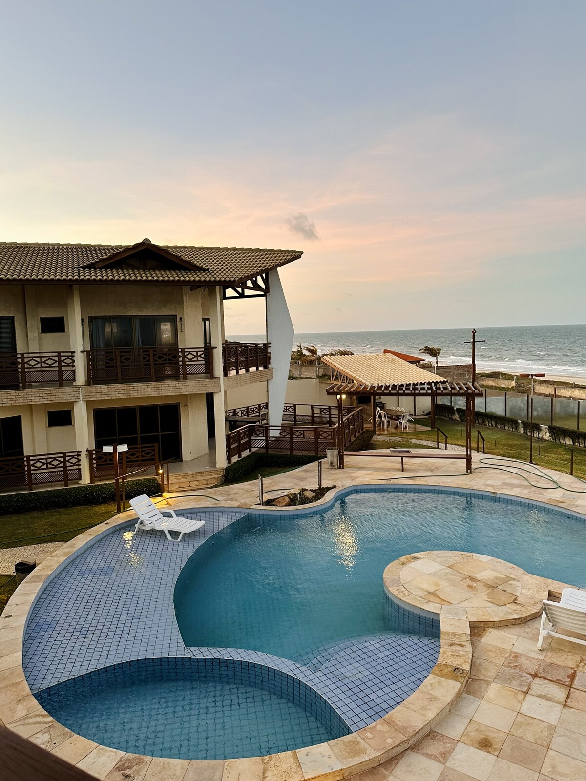Relaxe com toda a família nesta acomodação tranquila. Condomínio familiar para quem gosta de descansar, pé na areia, à 6 quilômetros do centro de beberibe e 200 metros do famoso banho de bica na natural que vem direto das dunas. O condomínio dispõe de duas piscinas, duas áreas de churrasqueira, campo de volei/futebol, ping pong, sinuca etc. Obs: varanda superior vista mar, lado sombra! Melhor vista do condomínio!