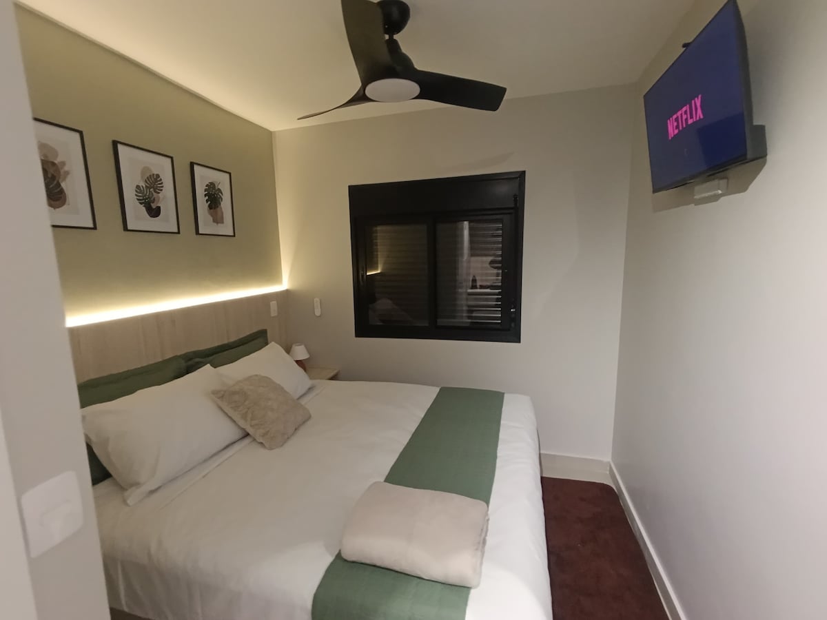 Hospédese en un departamento tipo hotel en el corazón de Itaim Bibi Comodidad, practicidad y una ubicación privilegiada, a pocos minutos del Parque Ibirapuera, de restaurantes, de bares y de los centros de negocios de São Paulo. Ideal para quienes buscan una estadía sin complicaciones, ya sea por trabajo o por placer. La suite es acogedora y tranquila, con una cama cómoda, perfecta para disfrutar de una excelente noche de sueño. El edificio ofrece servicios completos, que incluyen limpieza diaria, estacionamiento, gimnasio, piscina, sauna, restaurante y recepción bilingüe las 24 horas.