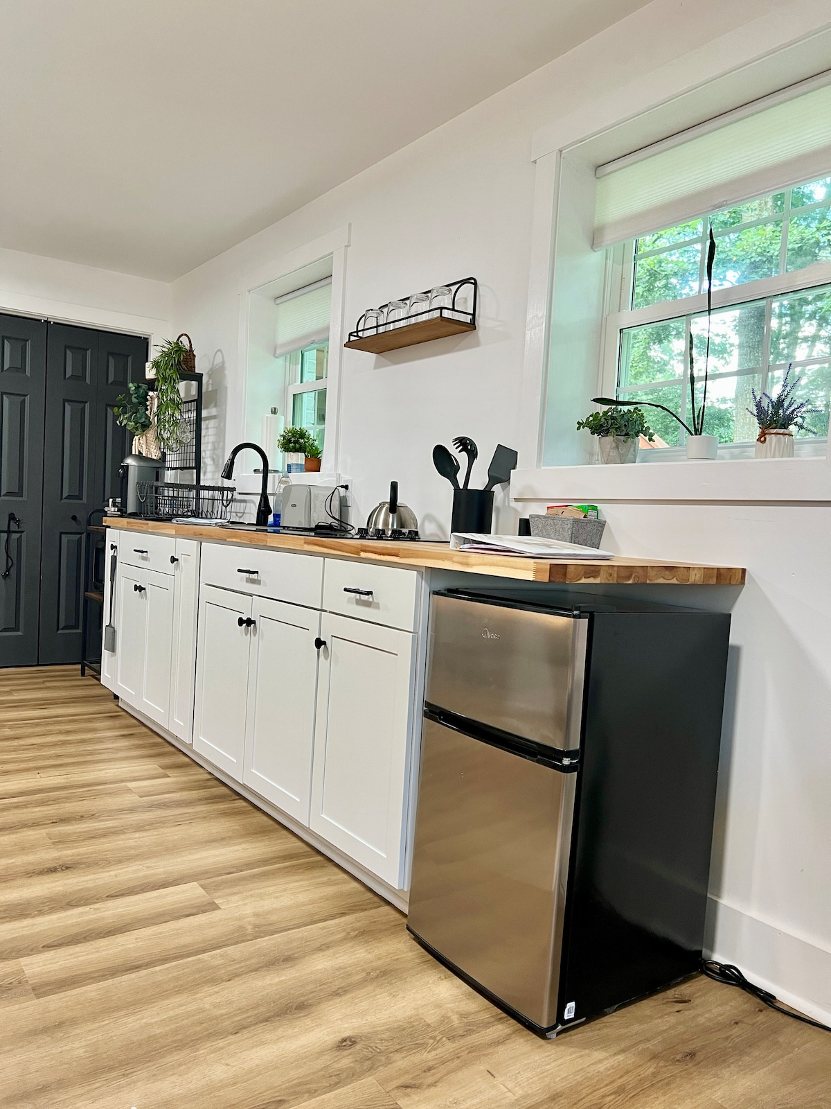 1000 sq ft of newly renovated space with generously stocked kitchenette, no sink in kitchen area but new full size fridge, freezer, air fryer with oven and broil. Marble walk-in shower with necessities 2 bedrooms one with a queen bed and second bedroom has two twin beds. A large driveway will accommodate multiple vehicles and private entrance with deck will welcome you to the apartment. Our central location is within 2 miles of Liberty University, Lynchburg Airport and ample shopping and dining.