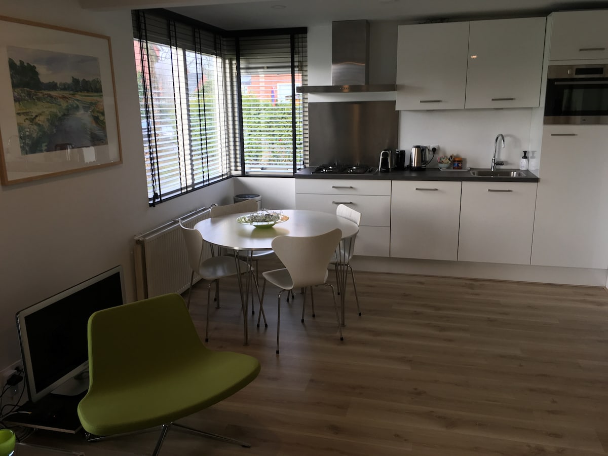 Casa independiente en Onnen (municipio de Groninga). Sala de estar, cocina totalmente equipada, amplio dormitorio, baño, pasillo y aseo. Elegante y moderno (diseño, arte). Un total de 57 m2. Hermosas vistas a los prados y a los bosques desde la habitación y desde la terraza soleada privada. Relájate y disfruta de la naturaleza. Aparcamiento gratuito en la calle. Magníficas rutas de senderismo y ciclismo desde la ubicación. Cerca de Pieterpad (1 km), Haren, Zuidlaren y la ciudad de Groninga.